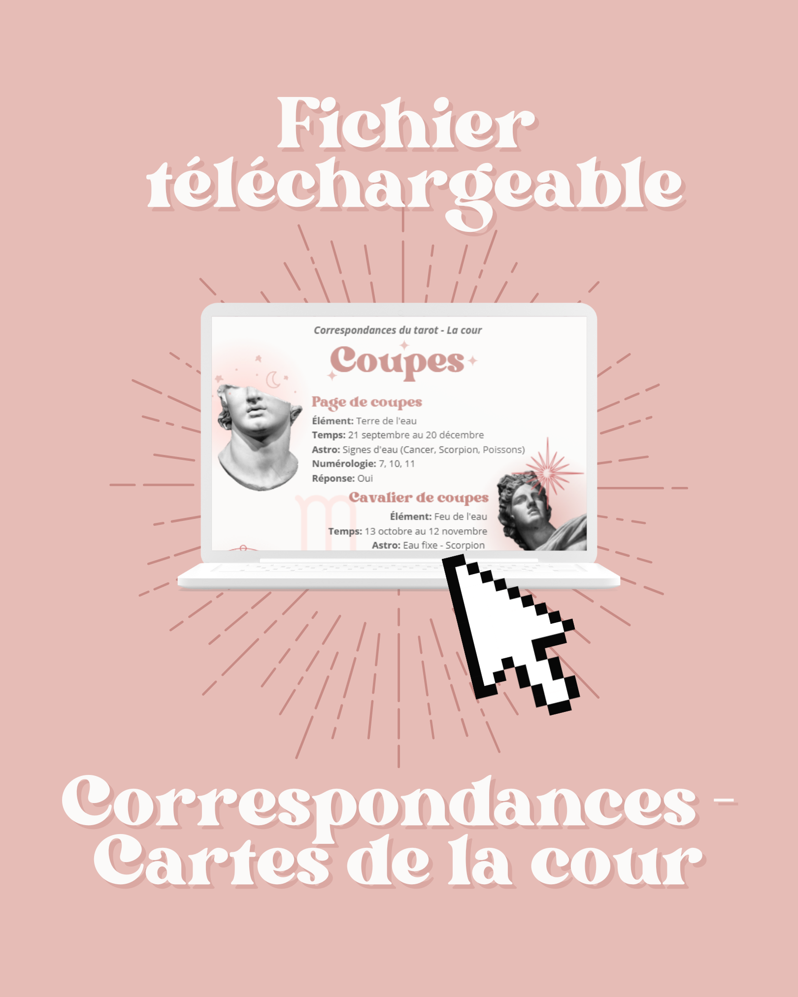 Vous retrouverez une fiche par suite, détaillant les correspondances les plus utiles lors de l'interprétation des cartes: astrologie, numérologie, dates, réponse oui ou non, éléments, le tout dans un fichier PDF téléchargeable* et imprimable.
