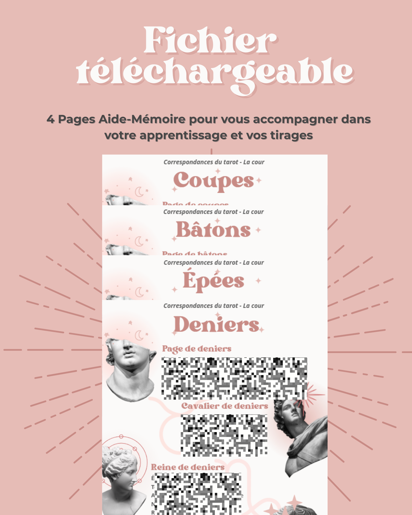 Les cartes de la Cour vous donnent du fil à retordre? Vous n’êtes pas seul·e. Pages, Chevaliers, Reines et Rois sont souvent les cartes les plus subtiles et les plus mal comprises du tarot. C’est précisément pour lever ce voile de confusion que j'ai créé ces 4 fiches de correspondances.